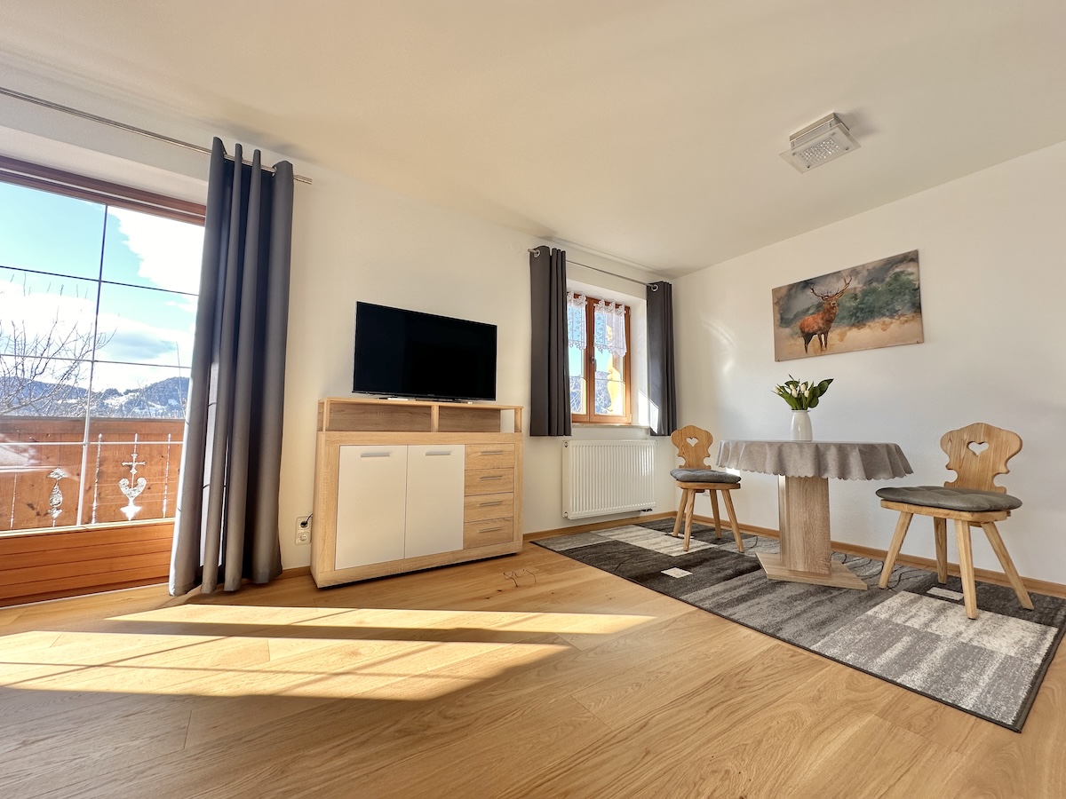 Diese Wohnung besteht aus einer seperaten Küche, einem großen Wohnzimmer, einem Schlafzimmer, einem Kinderzimmer, einem Bad mit Dusche, Süd- und Westbalkon und einem Rundumblick in die Berge.
